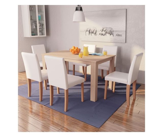 Το στιβαρό τραπέζι είναι κατασκευασμένο από μοριοσανίδα με φινίρισμα δρυός. Οι καρέκλες από απομίμηση δέρματος με πόδια οξιάς είναι σταθερές και ανθεκτικές. Χάρη στο καλά γεμισμένο κάθισμα και την πλάτη, οι καρέκλες είναι πολύ άνετες. Αυτό το ελκυστικό σετ είναι σύγχρονο και ταυτόχρονα πάντα στη μόδα. Είναι εύκολο στη συναρμολόγηση.