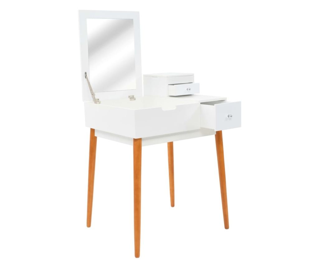 Αυτό το τραπέζι είναι κατασκευασμένο από MDF και διαθέτει γυάλινο καθρέφτη. Διαθέτει ένα πλαίσιο στα αριστερά που μπορεί να ανυψωθεί για να αποκαλύψει έναν καθρέφτη και ευρύχωρα διαμερίσματα για κοσμήματα. Το τραπέζι προσφέρει αρκετό χώρο για τα καλλυντικά, τα προϊόντα μαλλιών και τα προϊόντα περιποίησης της επιδερμίδας σας. Όταν ο καθρέφτης δεν χρησιμοποιείται, η επιφάνεια του τραπεζιού γίνεται το ιδανικό μέρος για μια ποικιλία προϊόντων μακιγιάζ, κοσμημάτων και ομορφιάς. Τα στιβαρά ξύλινα πόδια προσθέτουν σταθερότητα και συμβάλλουν σε ένα μοντέρνο στυλ mid-century.