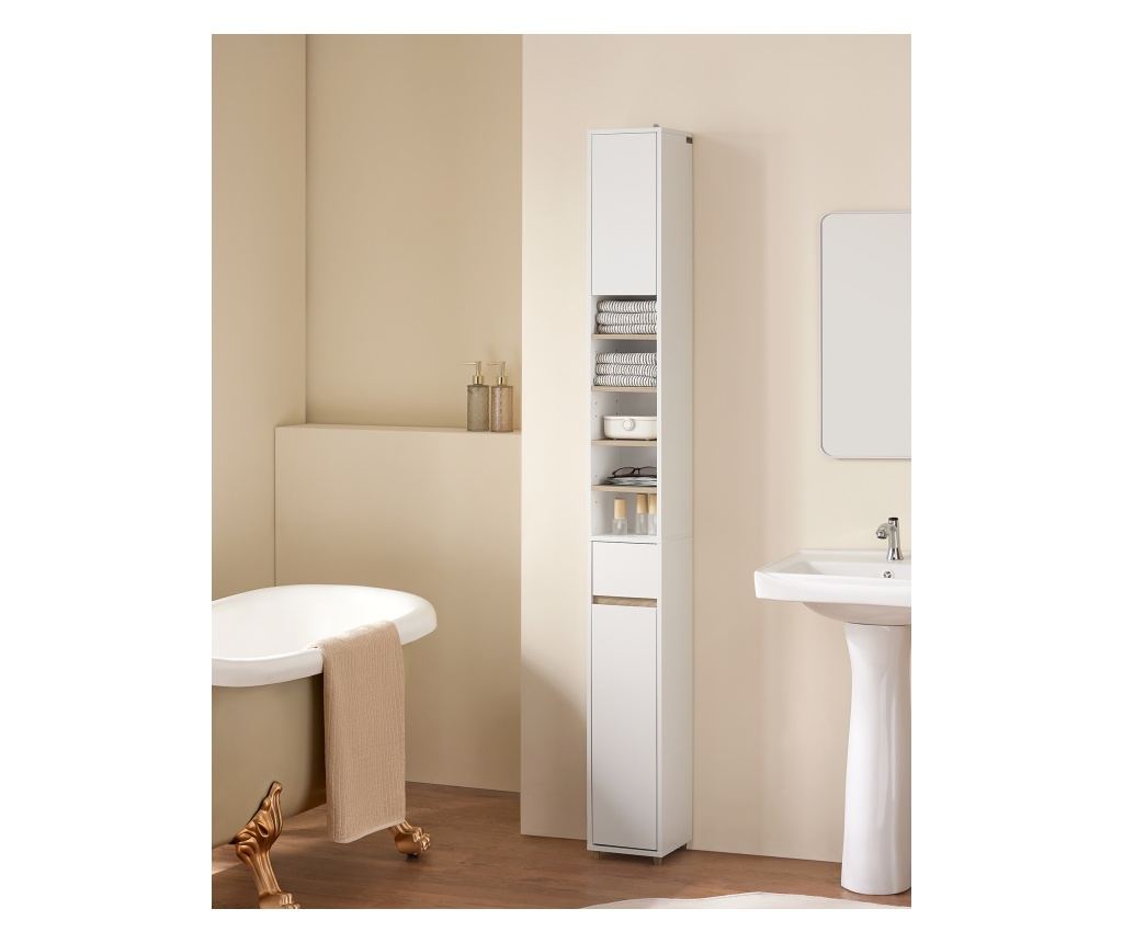 Χρησιμοποιήστε το ψηλό ντουλάπι όχι μόνο ως ράφι μπάνιου, αλλά και ως ράφι στο σαλόνι ή τοποθετήστε το, για παράδειγμα, στο διάδρομο ή στο υπνοδωμάτιο.