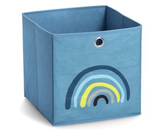 Αυτό είναι ένα μπλε κουτί αποθήκευσης με σχέδιο ουράνιο τόξο. Είναι κατασκευασμένο από μη υφαντό υλικό και έχει διαστάσεις περίπου 28 x 28 x 28 εκ.